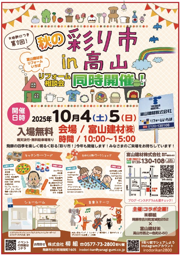昨年、多くの皆さまにご好評いただいた(株)柳組様主催の「彩り市」を、今年も富山建材にて開催いたします。